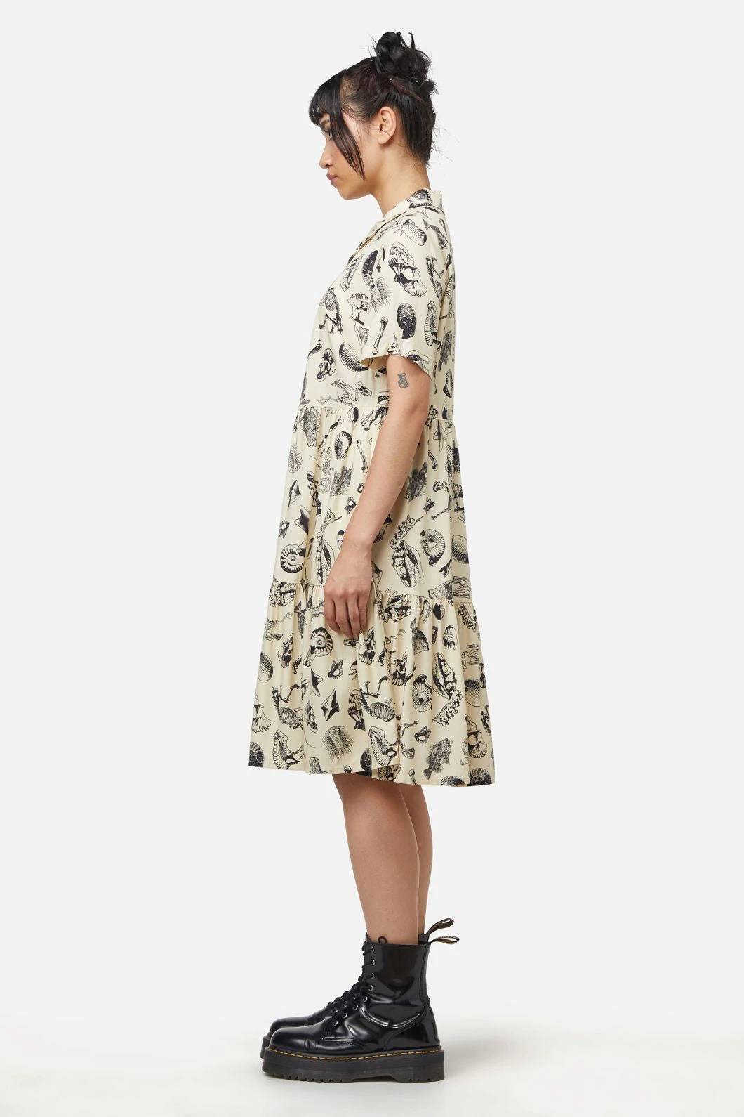 This unique baby doll dress combines a graphic flair with effortless comfort. Featuring the exclusive ‘Body Fossils’ print, it comes in a relaxed, oversized cut with T-shirt sleeves and a button-front detail, creating a casual yet edgy look. Made from soft viscose, this dress is perfect for easy styling and comfort.