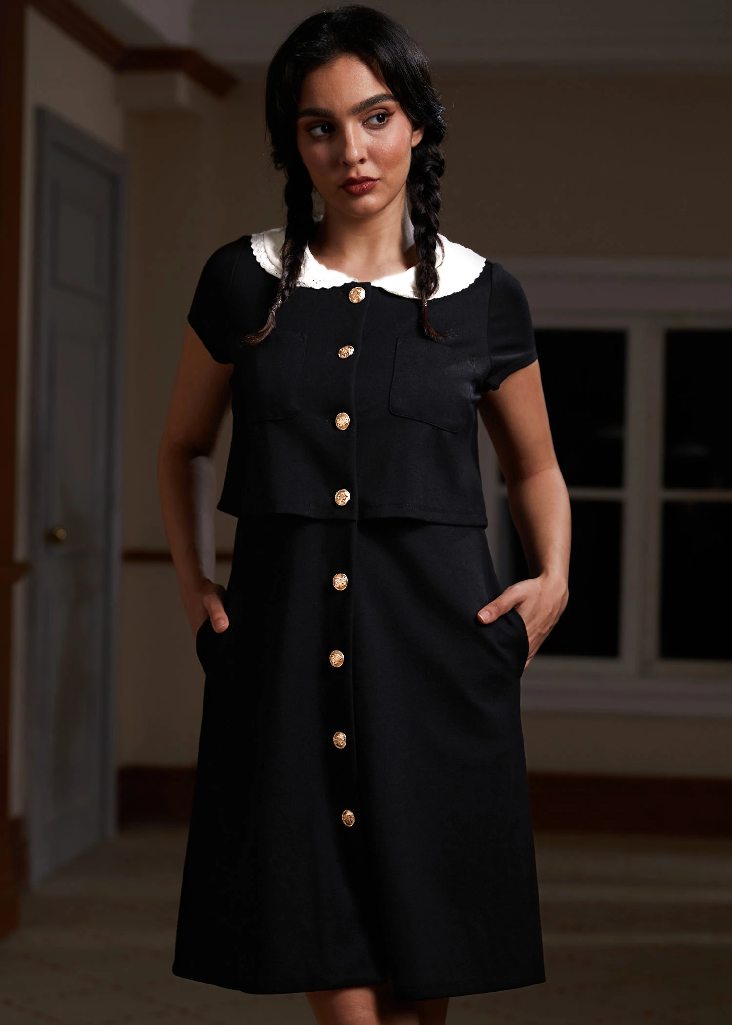 Fall Equinox Collared Dress from our ModCloth namesake label ushers in the autumn season with sleek sophistication. The black Ponte fabric knit, accented with a contrasting collar and front button detail, blends the classic with the new. Medium stretchability ensures a flattering fit, while pockets add practicality. This pullover dress is an ode to crisp fall days, ideal for both professional settings and cozy, casual gatherings.