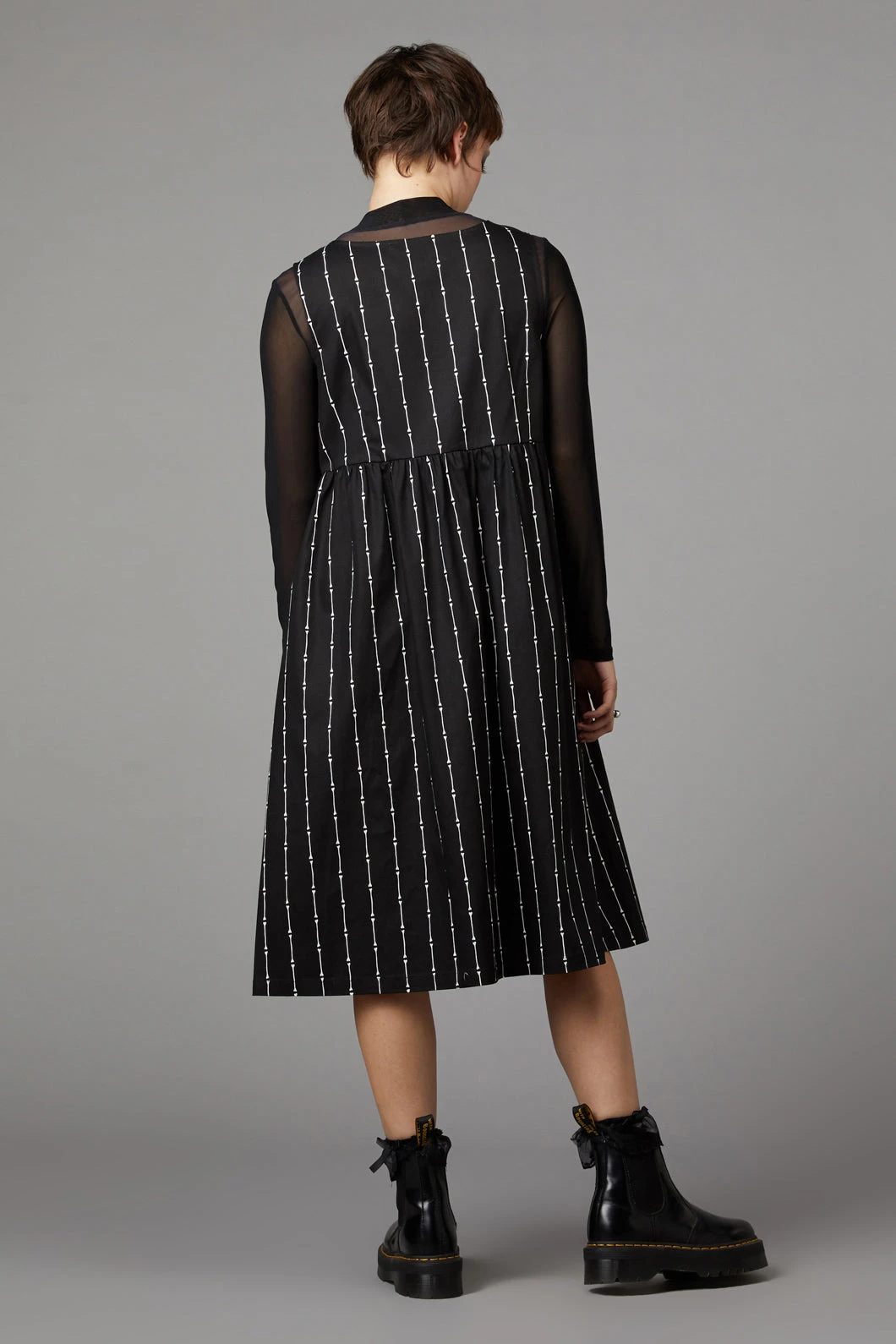 Get into the spooky spirit with the Funny Bone Pinafore, a gothic-inspired piece that adds a playful twist to your wardrobe. Featuring an all-over bones pinstripe graphic, this relaxed-fit pinafore combines dark, edgy vibes with a fun, quirky design. The sleeveless style and round neckline offer versatility, while the midi length provides a flattering, easy-to-wear silhouette.