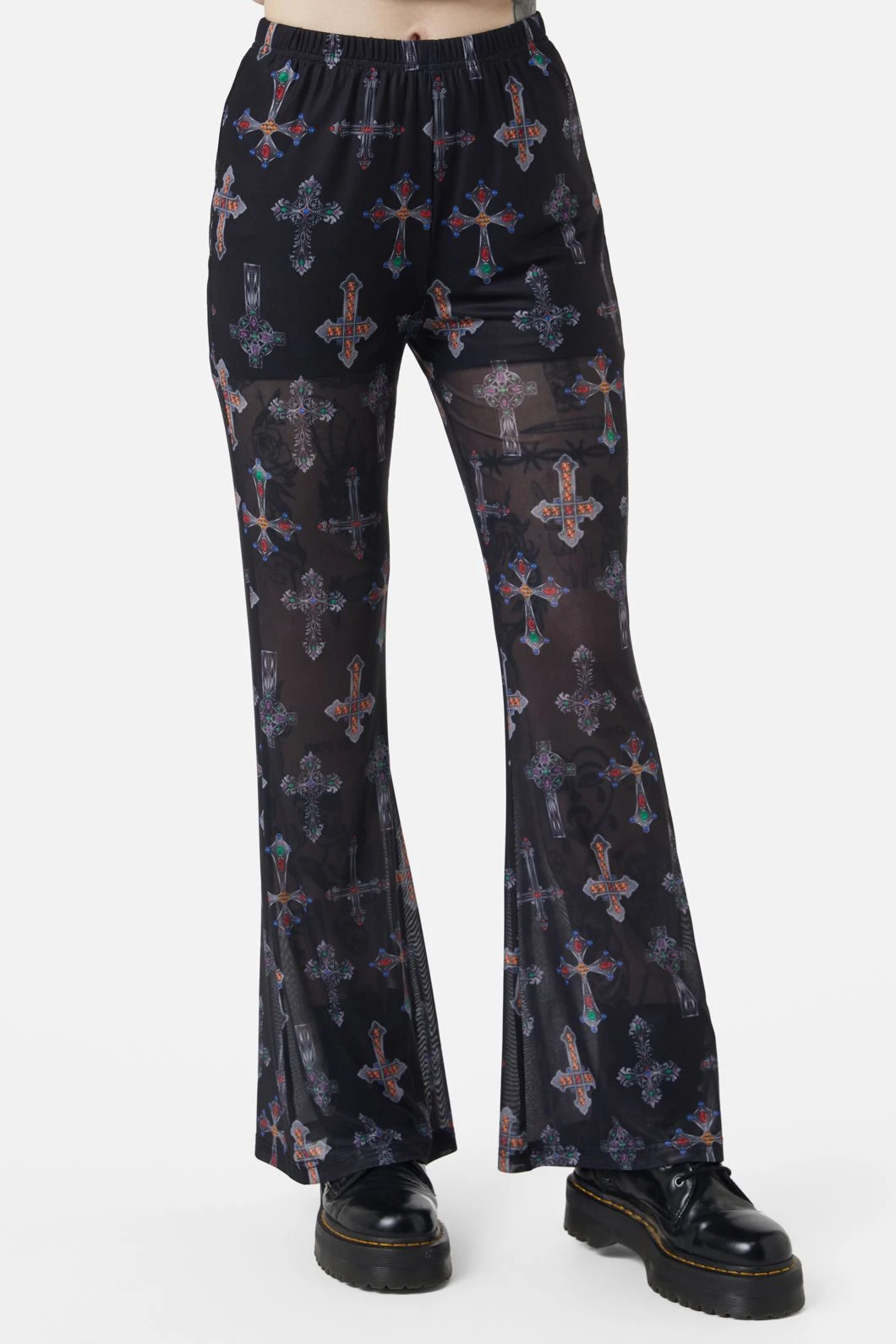 Find your stride with an irreverent edge in these Mesh Pants from Dangerfield. Crafted to create a striking silhouette, the flared leg sweeps with a bold and playful flair. Beneath the sheer outer shell, which whispers tales of maverick charm, there’s a clandestine layer of shorts offering a dash of modesty while inviting a glimpse of mystery. This fitted number with its snug shape showcases an audacious all-over printed crucifix pattern, dialing up the drama on classic black. The elasticated waistband assures that your comfort is never compromised, hugging gently while granting ease for life’s spontaneous jaunts. Made entirely from a gossamer polyester, they’re a statement piece meant for moonlit festivals or an offbeat coffee shop rendezvous. Embrace your unique spirit with a pair that claims the spotlight as you weave through your urban adventures.