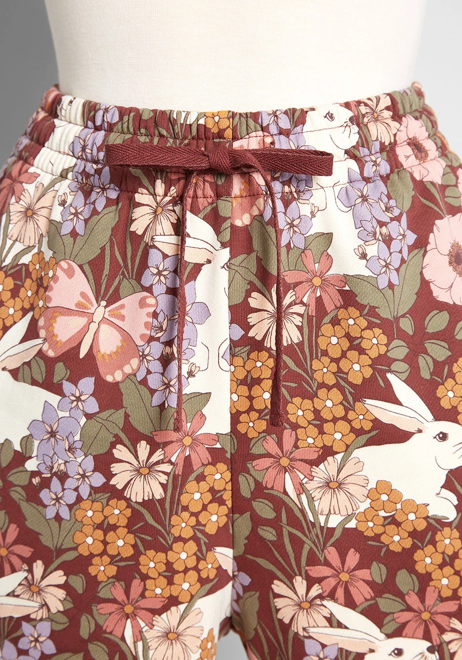 Atop a ruddy chocolate brown hue, this flourishing spring scene is bursting with floral blooms in creamy shades of pink, purple, and yellow. Pink butterflies hover above as adorable white rabbits peek out from beneath lush greenery, to make these drawstring shorts from Princess Highway a hopping good time. Made from a soft and stretchy cotton fabric, these breezy track shorts boast an elasticized waistband with drawstring closure, handy side pockets, and a retro-chic wide-leg silhouette.