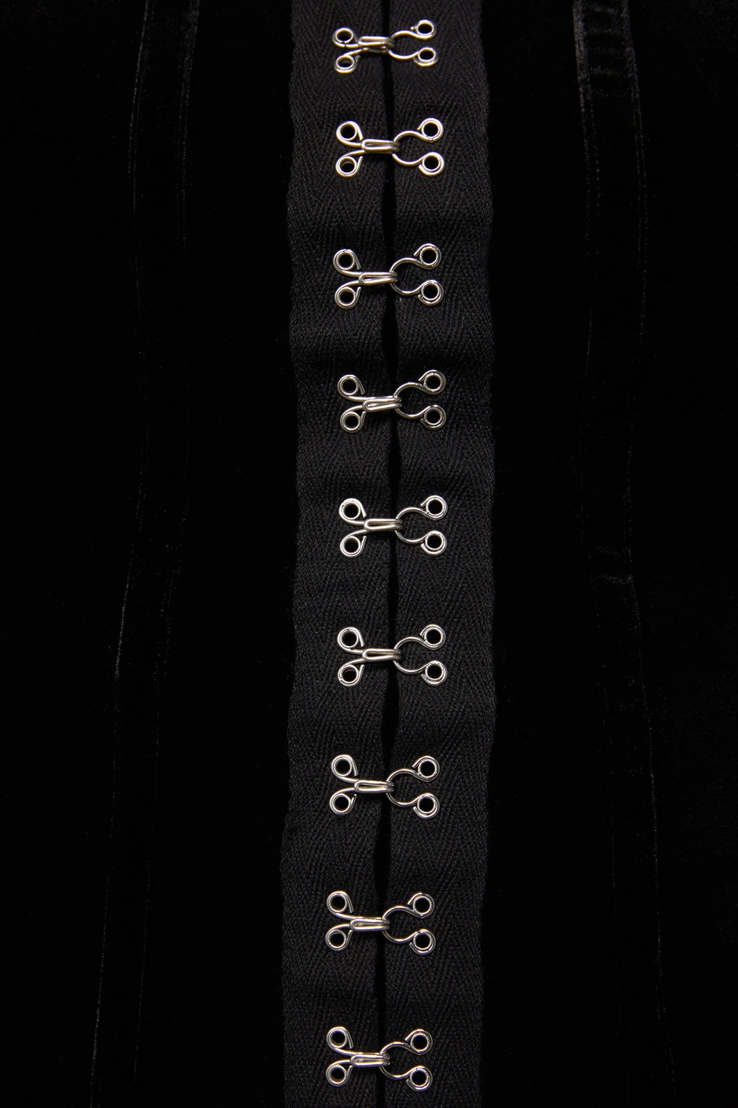 With hook and loop tape at the front for a secure closure, the dress cascades into a ruffled skirt adorned with delicate bows, creating a look that’s both enchanting and gothic. Crafted from luxurious stretch velvet, this dress feels as exquisite as it looks.